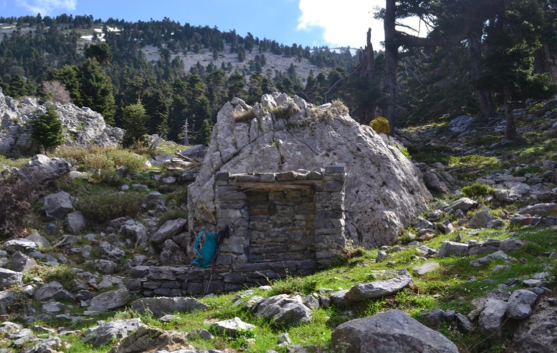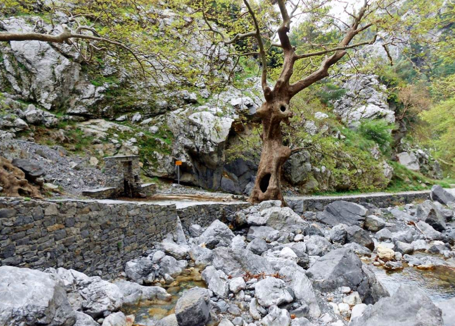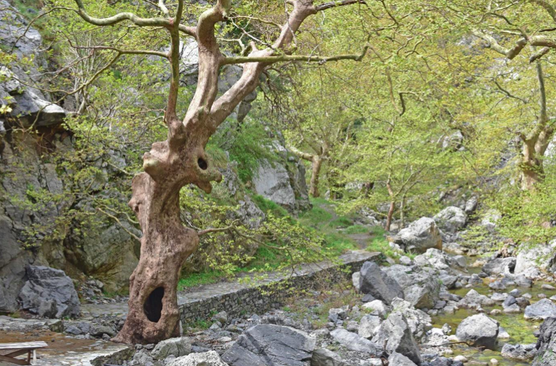 The path ascends gently, crossing small metal bridges, and leads us to Krátia spring, at 730 meters altitude — a tranquil spot shaded by a giant plane tree, perfect for rest and reflection before our descent back.